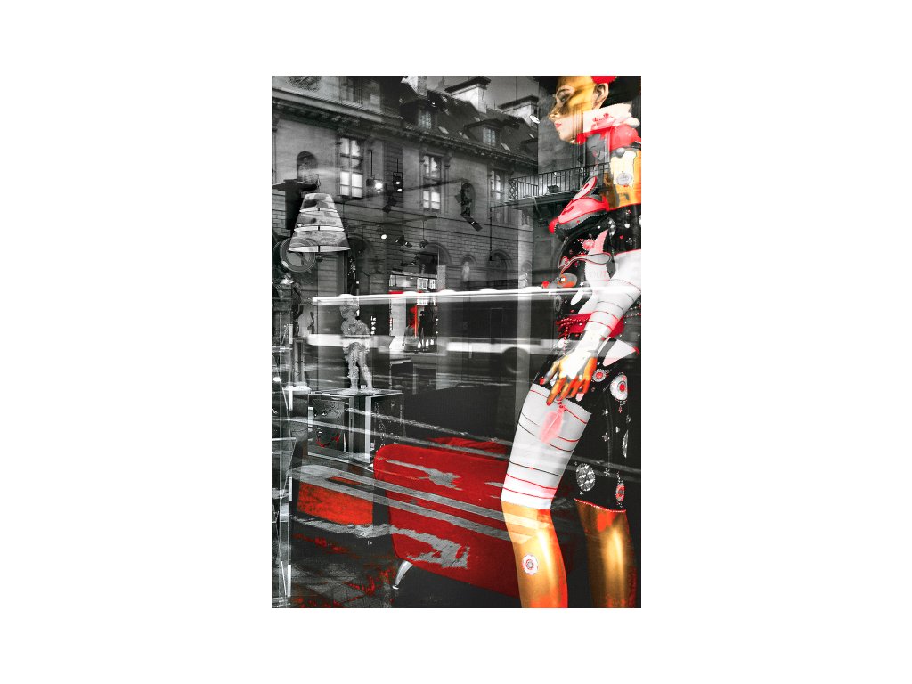 Táto fotografia slúži ako silná metafora: manekýn, stelesňujúci túto modernú "Venušu," akoby stál v momentálnom "odchode" (Exit) zo sveta klasickej čiernobielej reality, symbolizovanej odrazom historickej parížskej architektúry.